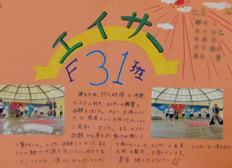 人のあたたかさ (D組 女子) この修学旅行は、私にとって本当に大事な思い出になりました。修学旅行委員として5月から計画してきたけど、最初はうまくいくのか、クラスがまとまっていけるのか正直不安でした。だけど月日が経つにつれ、学年アワーや交流パーティーに向けてみんなが協力しあえる環境になってきたと思います。いつも放課後残ってシナリオを考えてくれた人、部活で忙しくても少しだけでもといってそれに協力してくれた人、みんなの協力があったから2つともいいものができたと思います。特に、学年アワーは制限時間の5分を過ぎていたにもかかわらず、3位という良い結果で本当に嬉しかったです。 宮古島での民泊は、感動と人の温かさであふれていました。行く前はすごく緊張していたけど、お母さんの優しい笑顔を見て、2泊3日楽しめるぞと確信しました。きれいな海に夕日、星空を見て、もやもやしていた気持ちも一気に晴れるようでした。お母さんは時間が少ない中でも私たちが楽しめるように、私たちのためにいろんな場所に連れていってくれたし、おいしいご飯もたくさん作ってくれました。宮古島のいいところもいっぱい教えてくれたり、進路のこととかも話したりしました。班の皆とも一緒に過ごせたのが本当に楽しかったし、より仲良くなったと思います。お父さんやお母さん、また友達とも過ごしたことで、人とのつながり、温かさを改めて実感しました。修学旅行のテーマ“Link”にぴったりだったと思います。カメラの中にある写真も、それ以上に思い出が詰まった心の中も、全部宝物です。宮古島に行くことができて幸せでした。D組のみんなで過ごせて幸せでした。またいつか宮古島に帰って、お父さん、お母さんと会いたいです。 |