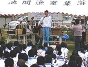 | 坂田さん、森山さんの司会進行で、交流パーティーが始まりました。 わーぶに汁、わーの味噌煮を食べながら、お世話になった漁家さん、農家さんと広場で交流パーティーをしています。わー、とは豚こと、ぶに、とは骨のこと。 |