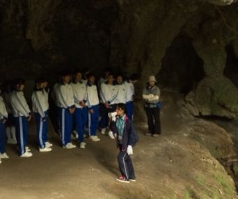 | チビチリガマにて平和学習 手前左の木は石灰岩に根を生やしたガジュマルです | |